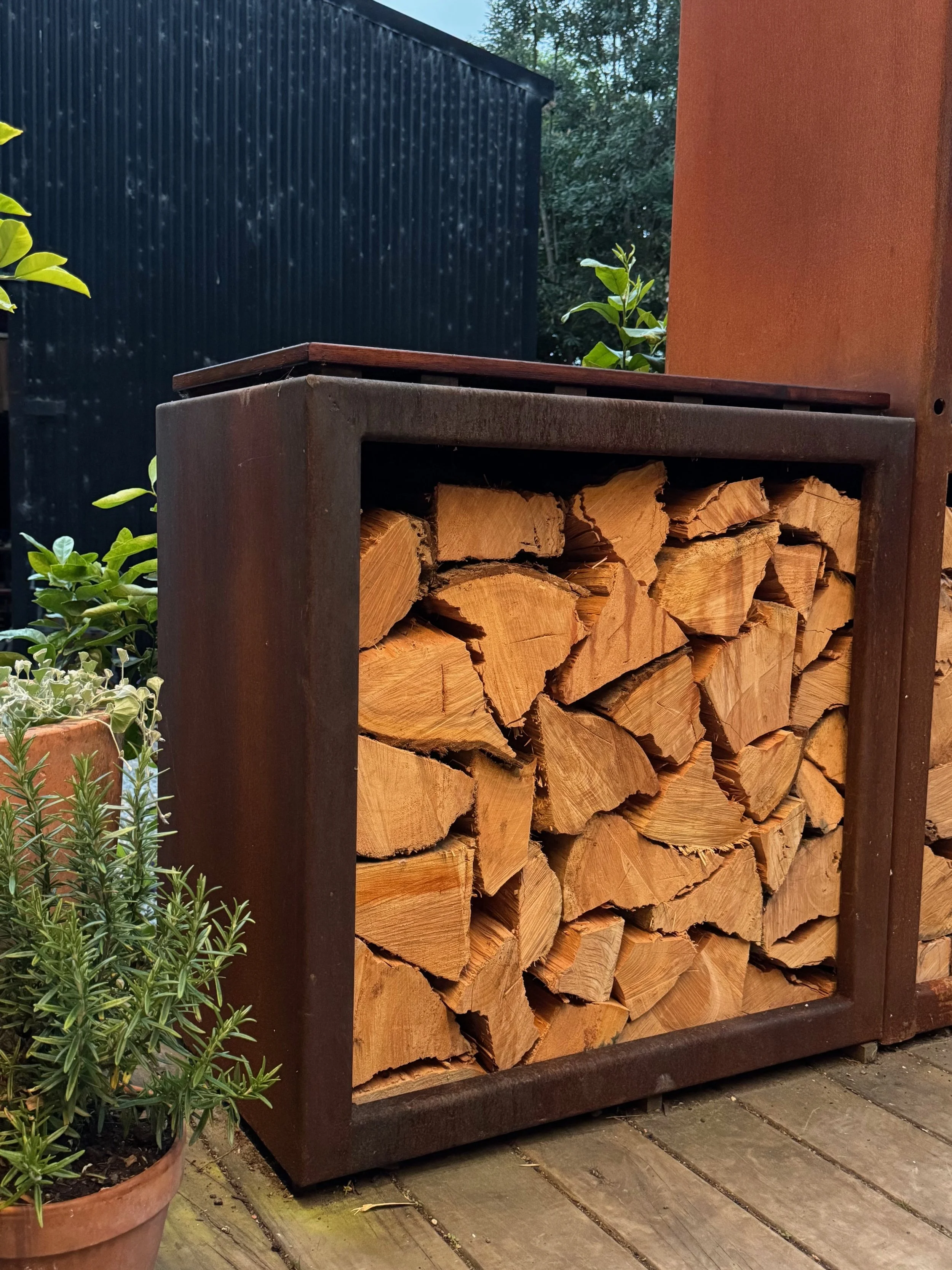 Keeps your wood supply dry and doubles as outdoor kitchen bench space.